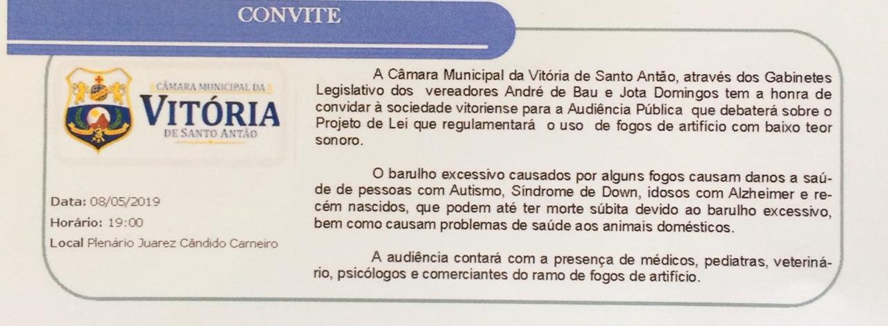 Registro o recebimento do convite, enviado pelos vereadores André de Bau e Jota Domingos, para a Audiência Pública que acontecerá no próximo dia 08 de maio, às 19h no plenário da Casa Diogo de Braga. O encontro tem como objetivo debater sobre o Projeto de Lei que visa regulamentar o uso de fogos de artifício no nosso município. No que se refere ao conteúdo do convite – pelas minhas inferências – perece-nos que já existir uma pré-disposição dos autores pela proibição dos fogos tradicionais. Independente de qualquer coisa é bom que esse assunto seja discutido e debatido. Por várias vezes já cobrei das autoridades locais uma clareza nessa matéria: