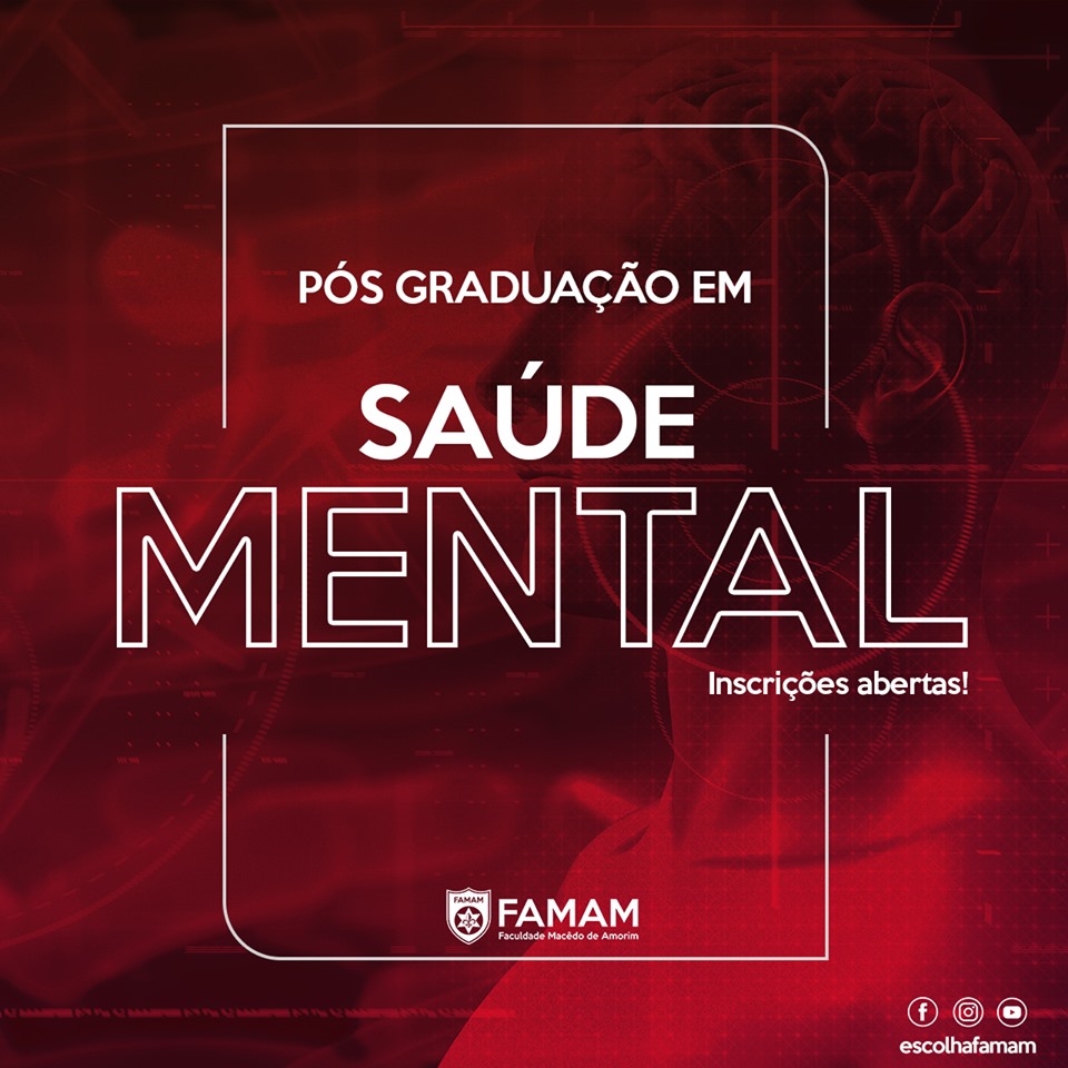 A pós-graduação em Saúde Mental tem o objetivo de formar um profissional capaz de identificar demandas específicas relacionadas à saúde mental, bem como planejar, organizar e executar ações terapêuticas e projetos de atenção psicossocial que promovem a prevenção/promoção e assistência. Inscreva-se através do nosso portal:🖥www.escolhafamam.com.br ou através dos Telefones  81 3523.1559/ 📲 98811.1559 (Whatsapp).