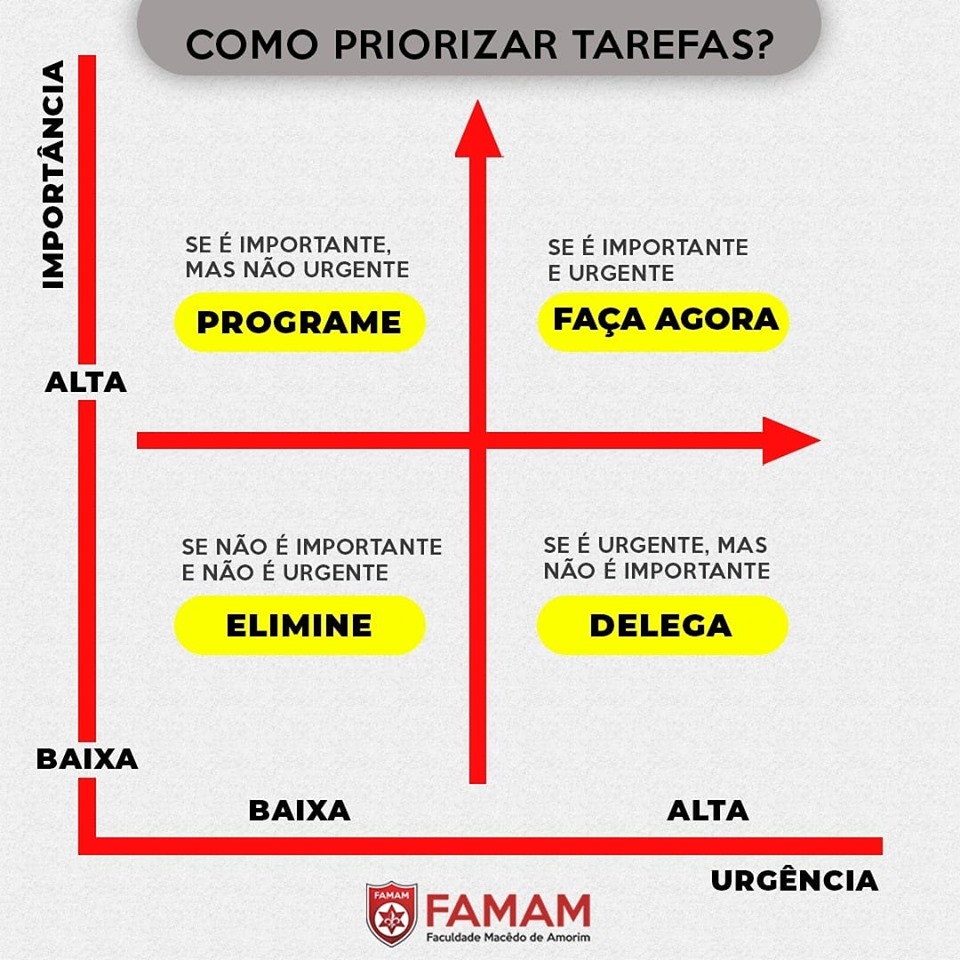 Momento FAMAM – Faculdade Macêdo de Amorim Publicado em 12 de setembro de 2019 por Cristiano Pilako Aprenda a organizar as suas tarefas diárias. Faça um planejamento para, a partir daí, escolher o que merece prioridade.