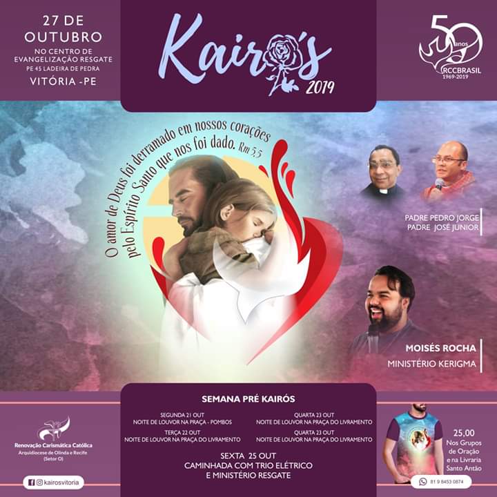 Uma grande programação marcará, na nossa cidade, a passagem dos 50 anos RCCBRASIL (1969 – 2019). Começando no dia 21 de outubro, na cidade de Pombos, o evento segue nos dia 22-23-24, 25 com uma grande caminhada pelas centrais acompanhada por um trio elétrico. No dia 27, evento no Centro de Evangelização Resgate (Ladeira de Pedra). Segundos o amigo e integrante da comunidade católica na Vitória de Santo Antão, Apolinário Junior, esse movimento na nossa terra teve inicio, há mais de quatro década, com um grupo liderado pelo inesquecível Joca Neri. Veja o vídeo.