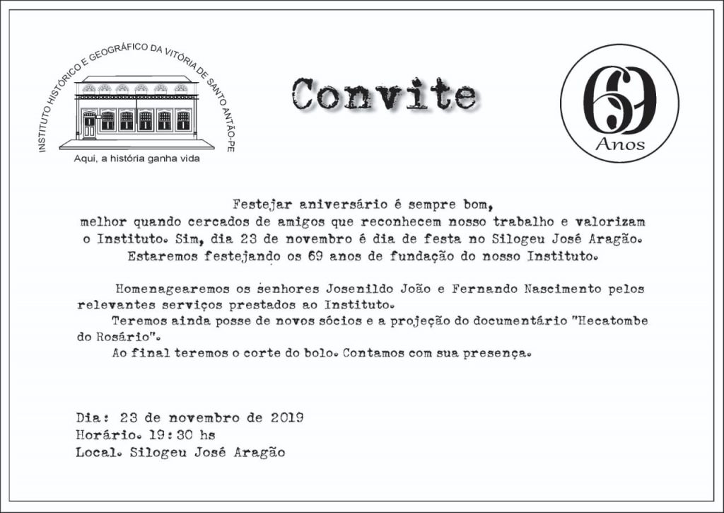 CONVITE: aniversário do Instituto Histórico – nesse sábado 23 – 19:30h. Publicado em 22 de novembro de 2019 por Cristiano Pilako