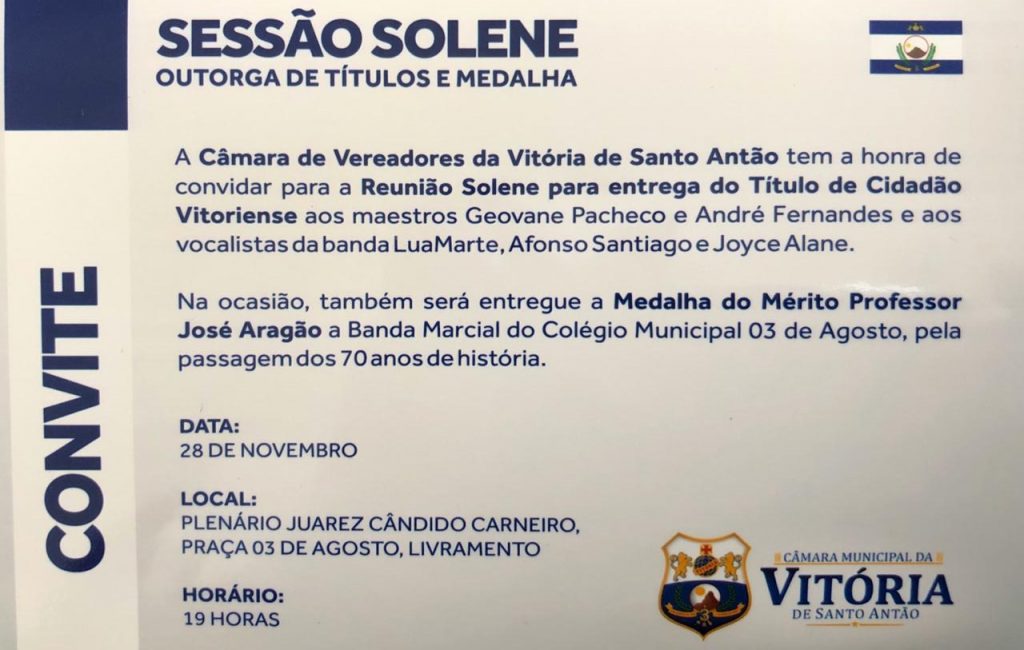 Câmara de Vereadores: Sessão Solene – Hoje – 19h Publicado em 28 de novembro de 2019 por Cristiano Pilako