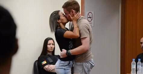 A mulher que tomou 5 balaços do namorado, em Venâncio Aires, RS, foi ao julgamento do réu, rogando ao juiz permissão para beijá-lo. Totalmente empinada e morta de saudade, anestesiada pela paixão, taca-lhe um salivado beijo na sessão. Até, aqui, não se sabe se tomou um tiro de raspão na cabeça, comprometendo-lhe a razão. A policial que aparece na fotografia, tomando conta do casal, mostra-se prostrada e sisuda de indignação.