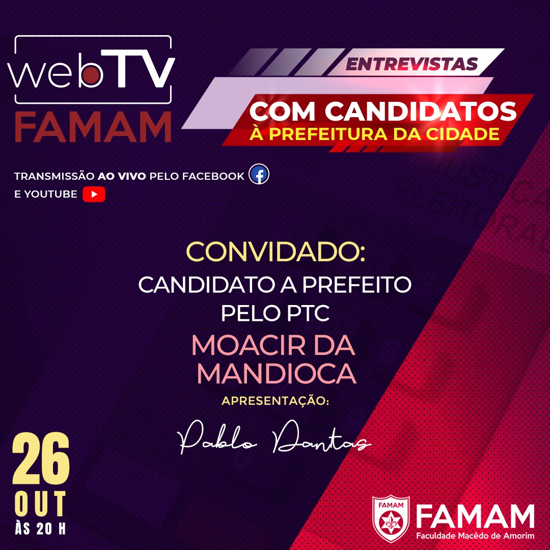 Hoje, segunda-feira, dia 26, a WEB TV FAMAM receberá, às 20 horas, o candidato do PTC – Moacir da Mandioca. No dia 28 (20h) será a vez da candidata do PDT – Hérika Araujo. Na sequencia, dia 04 de novembro (20h), Paulo Roberto (MDB). No dia 09 (20h), Antonio de Lemos (DEM). Dia 11 – 19h – o candidato a vice da “Coligação Frente Popular da Vitória”, Henrique Queiroz. E fechando a série, no mesmo dia 11, às 20h, o candidato do partido CIDADANIA, Toninho Nascimento.