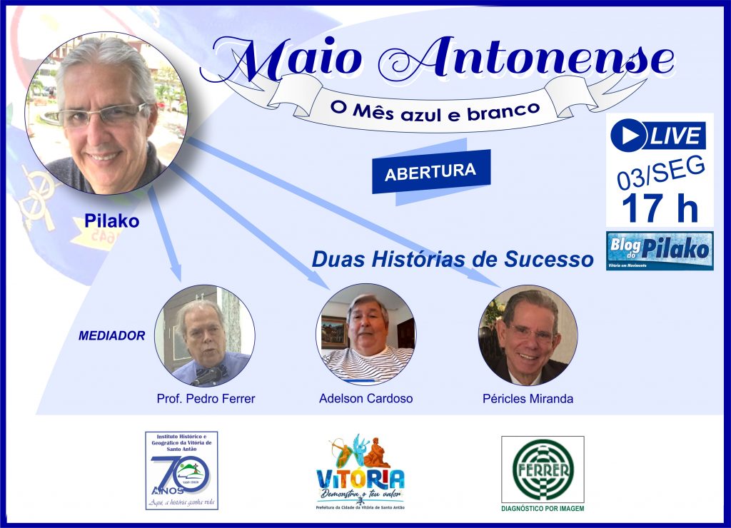 Dentro da programação cívica, promovida pelo Blog do Pilako com apoio cultural do Instituto Histórico e Geográfico da Vitória de Santo Antão, daremos,  nessa segunda-feira, dia 03 de maio,  o “pontapé” inicial do Projeto “Maio Antonense” – o mês azul e branco.  Esse projeto, gestado desde o ano de 2019, inicialmente, tinha como ponto de partida eventos que deveriam acontecer no  ano de 2020, mas, por conta dos impedimentos pandêmicos, foram  adiados e reconfigurados para  serem efetivados em 2021, evidentemente modificados  na forma sem prejuízo  na  essência original.