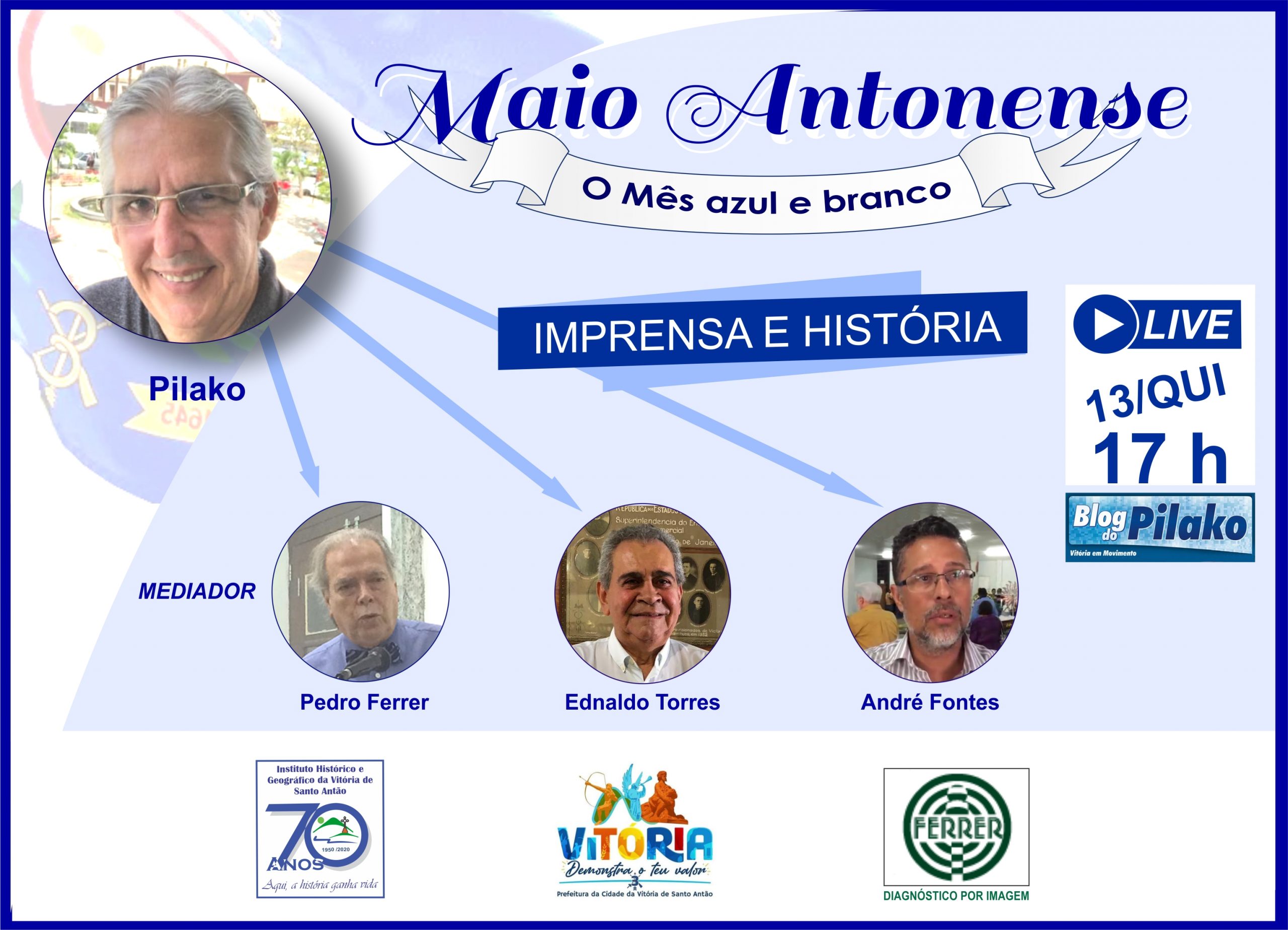 Dando sequência ao Projeto “Maio Antonense” – o mês azul e branco, amanhã, quinta-feira, dia 13, estaremos promovendo a 3ª LIVE com o tema: IMPRENSA E HISTÓRIA. Abordaremos, entre outras coisas, a importância da imprensa local na construção da historiografia antonense.