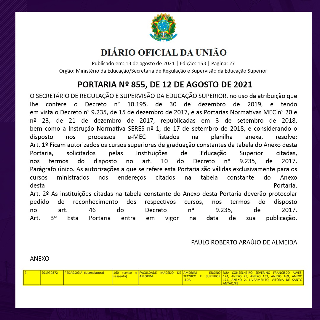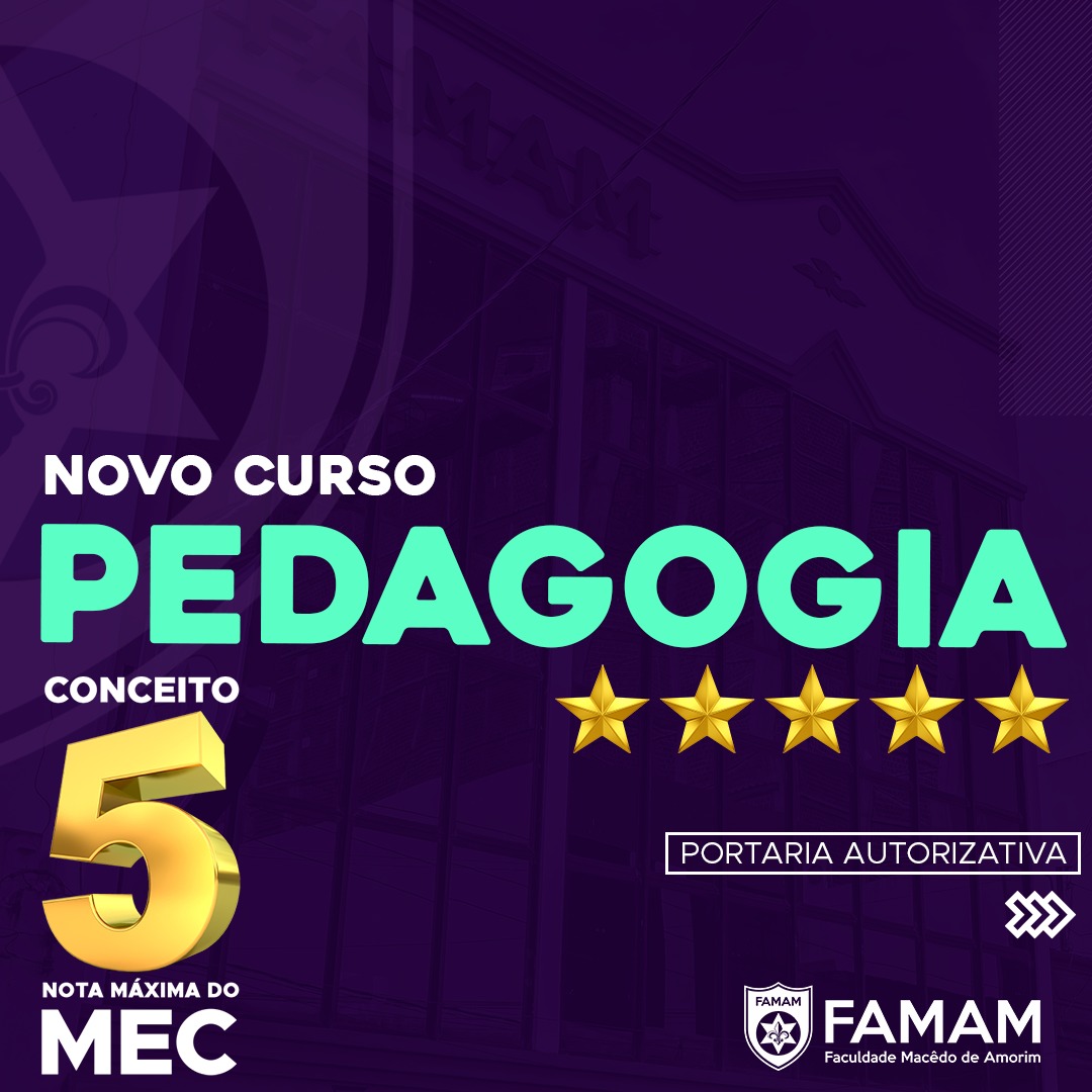 A FAMAM – Faculdade Macêdo de Amorim tem a satisfação de comunicar a AUTORIZAÇÃO de mais um curso: PEDAGOGIA, que obteve NOTA MÁXIMA DO MEC. Isso mesmo! Na FAMAM, PEDAGOGIA é CONCEITO 05 DO MEC! Somos a única Faculdade, em Vitória e região, a oferecer o curso de PEDAGOGIA COM CONCEITO 05 DO MEC! Portaria nº 855, de 12 de agosto de 2021, publicada no Diário Oficial da União em 13.08.2021. AQUI, A FAMAM LIDERA!!!!!! Escolha FAMAM – VOCÊ CONHECE, VOCÊ CONFIA!