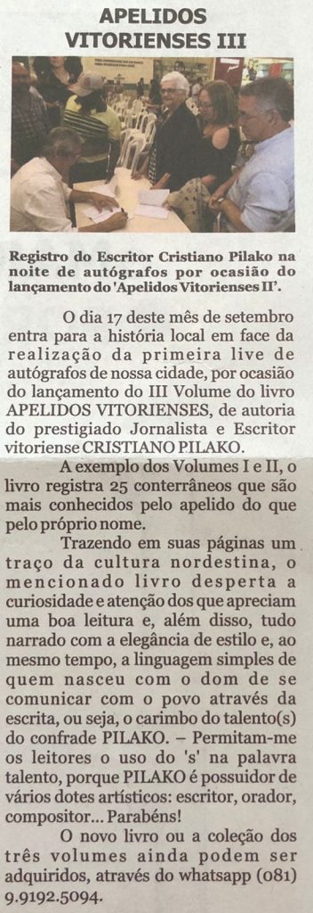Num só tempo registro e agradeço ao amigo jornalista José Edalvo, pela generosa nota publicada no seu importante veiculo de comunicação que se configura em verdadeiro e importante ativo da nossa Vitória de Santo Antão – Jornal da Vitória.