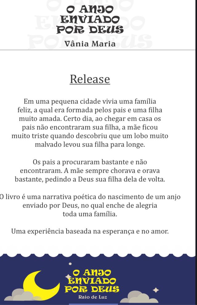 Lançamento de livro: O ANJO ENVIADO POR DEUS.