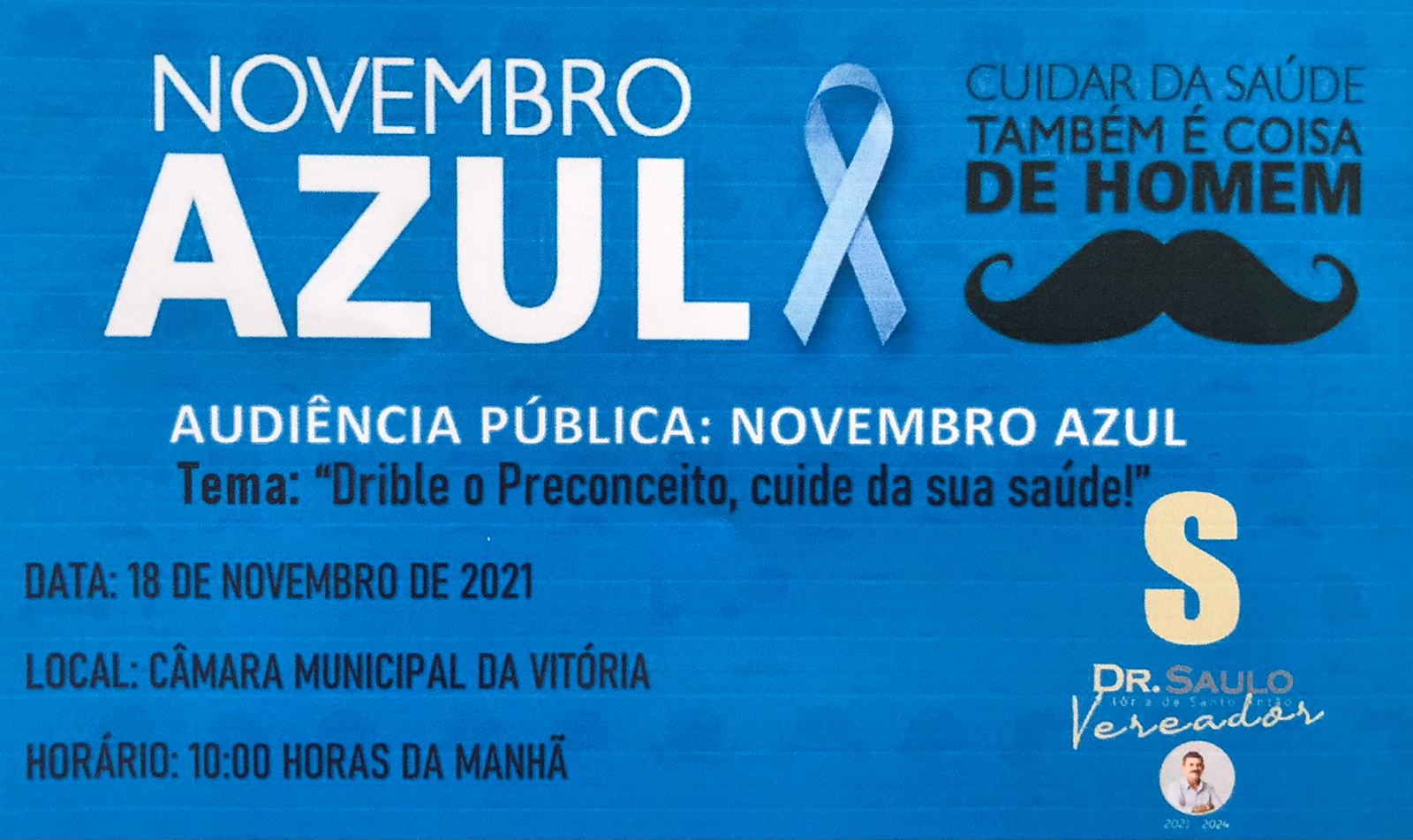 Registramos o convite para participar da Audiência Pública: Novembro Azul – “Drible o Preconceito, Cuide da Sua Saúde”. A mesma foi uma iniciativa do vereador Doutor Saulo e acontecerá na Câmara de Vereadores da Vitória, no próximo dia 18 de novembro, às 10h.