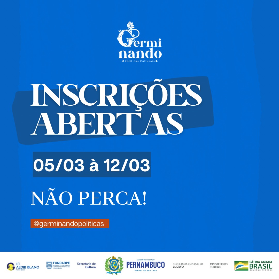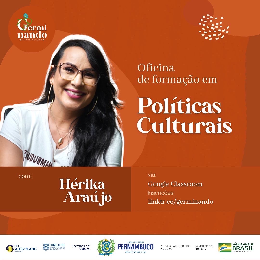 Estão abertas as inscrições para a formação Germinando Políticas Culturais (@germinandopoliticas). A ação possui incentivo da Lei Aldir Blanc de Emergência Cultural de Pernambuco, que tem como objetivo socorrer o setor cultural impactado pela pandemia do Covid-19.