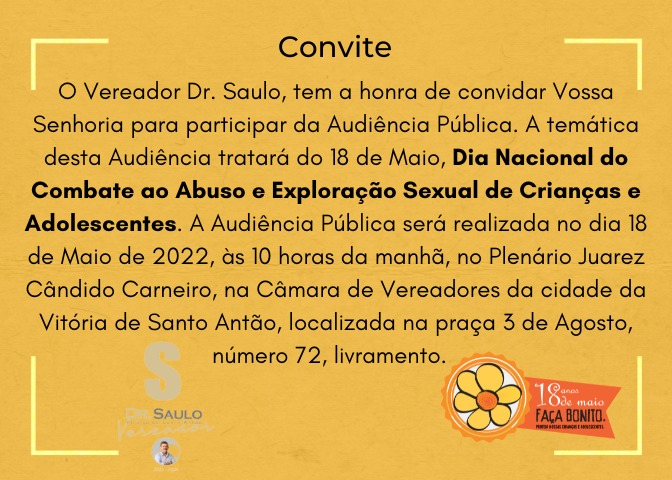 CONVITE: Doutor Saulo – Audiência Pública – Dia Nacional do Combate ao Abuso e Exploração Sexual de Crianças e Adolescentes. Publicado em 17 de maio de 2022 por Cristiano Pilako