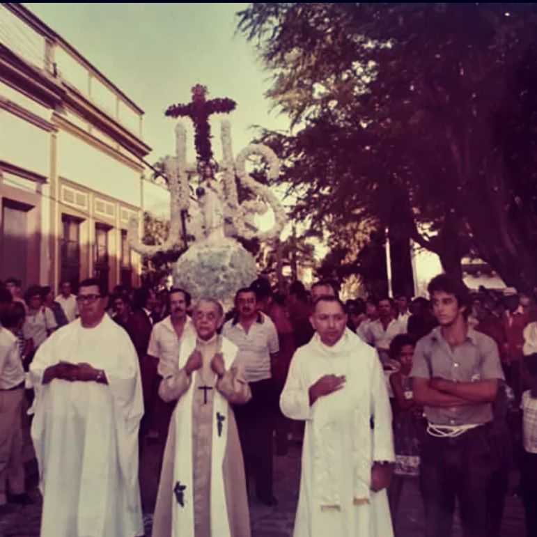Registro de Dom Hélder Câmara desfilando pelas ruas do sítio histórico de Olinda em um dia de Corpus Christi.