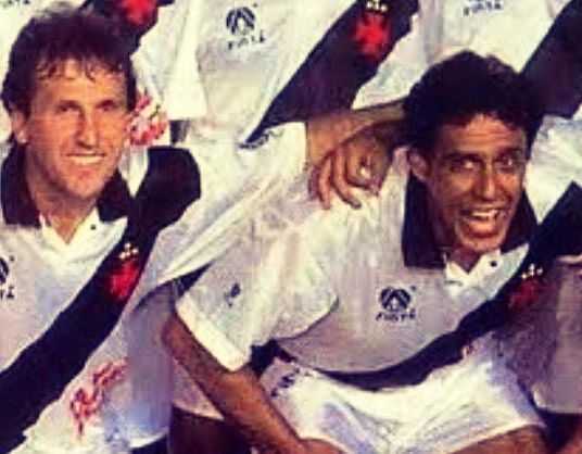 Zico deixa a rivalidade de lado e veste a camisa do Vasco da Gama para homenagear o amigo Roberto Dinamite, em 1993.