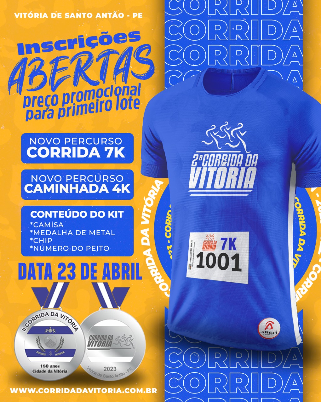 2ª Edição da Corrida e Caminhada da Vitória – inscrições abertas. Publicado em 13 de janeiro de 2023 por Cristiano Pilako INSCRIÇÕES AQUI: http://www.corridadavitoria.com.br/