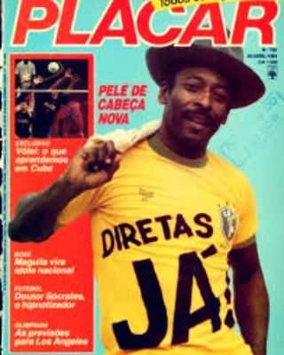 A icônica foto do Rei Pelé vestido com a camisa das “Diretas Já” estampou a capa da Revista Placar, em abril de 1984.