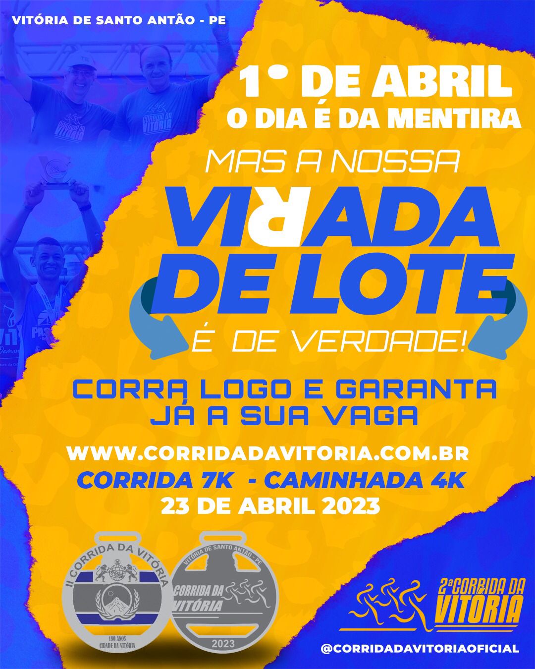 Dia 1º de abril é o dia da mentira, mas a virada de lote da 2ª Corrida e Caminhada da Vitória é de verdade!!! – É NESSE SÁBADO!!! Publicado em 31 de março de 2023 por Cristiano Pilako INSCRIÇÃO: http://WWW.UPTEMPO.COM.BR SITE OFICIAL: http://WWW.CORRIDADAVITORIA.COM.BR