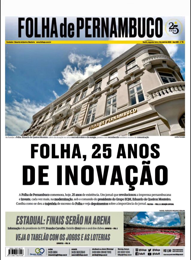 Através da postagem do Blog do Magno Martins, tomei conhecimento da “Boda de Prata” do Jornal Folha de Pernambuco que justamente é hoje – 03 de abril de 2023. Não sabia que havia sido nesse dia (03/04), mas lembro-me bem que comprei um exemplar no dia da sua estreia nas bancas. Acredito que se procurá-lo nos meus arquivos encontrá-lo-ei.  Salve engano, custava $0,25 ou $0,50  – o preço era anunciado com a foto de uma moeda.