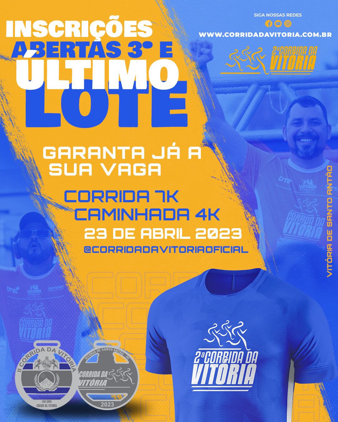 2ª Edição da Corrida e Caminhada da Vitória – últimos dias para inscrições… Publicado em 11 de abril de 2023 por Cristiano Pilako INSCRIÇÃO: http://WWW.UPTEMPO.COM.BR SITE OFICIAL: http://WWW.CORRIDADAVITORIA.COM.BR