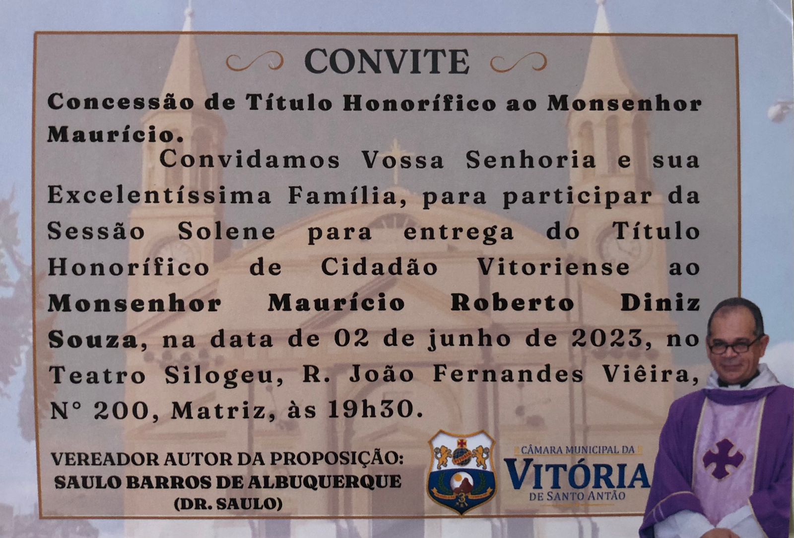 CONVITE – Monsenhor Maurício Diniz – Título de Cidadão Vitoriense. Publicado em 2 de junho de 2023 por Cristiano Pilako