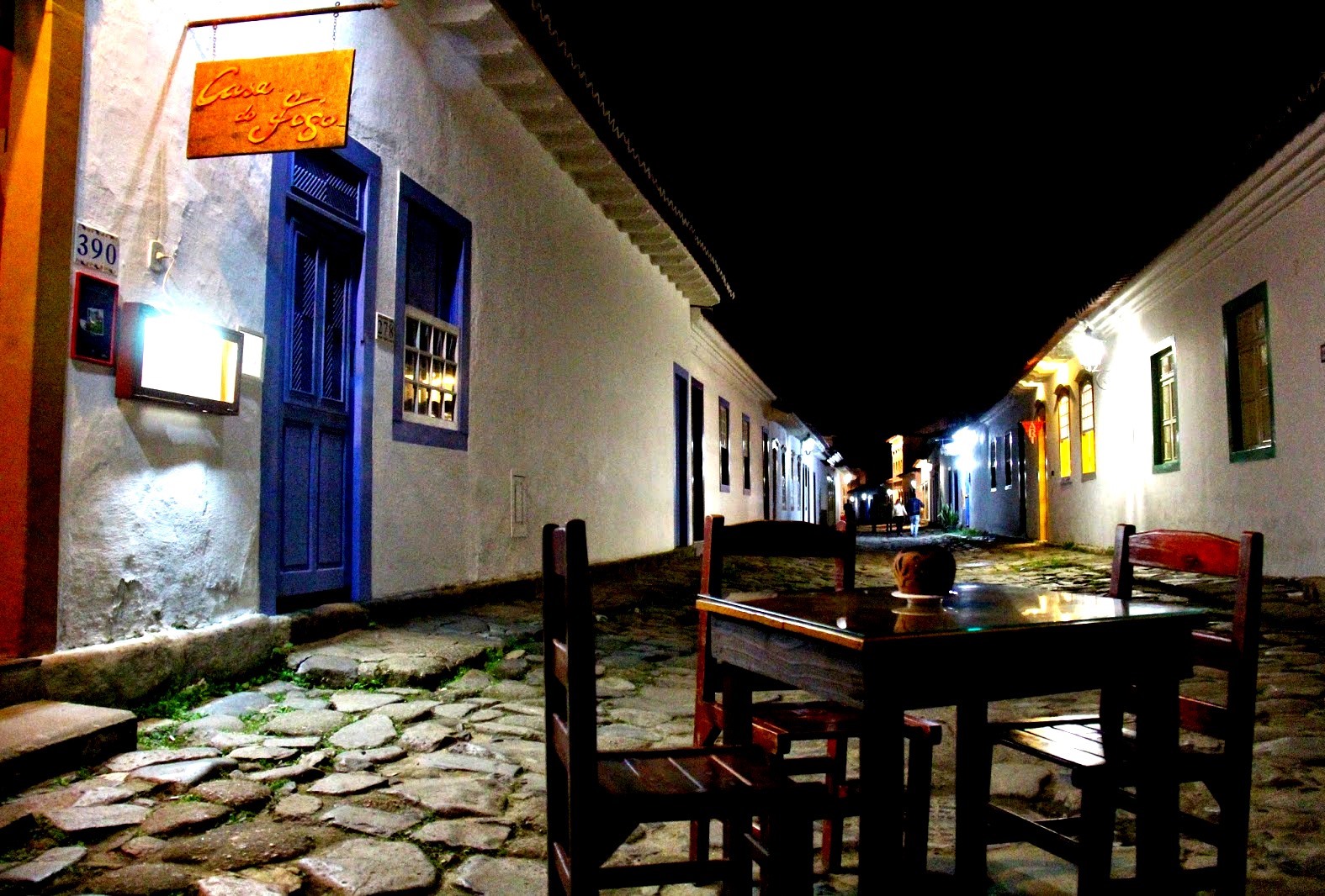 Estando em Paraty, gosto de fotografar à noite, atento ao mais ínfimo do cotidiano da cidade quando dorme, quando a flama do sol está longe de aquecer o céu nublado. Fiz essa Foto numa madrugada de Junho, a estação mais fria do local. Nessa rua morava a divina atriz de Teatro, Maria Della Costa, fui hóspede mais de uma vez de sua famosa pousada. Recordo-me do que ela dizia. Suas palavras davam frescor à alma.