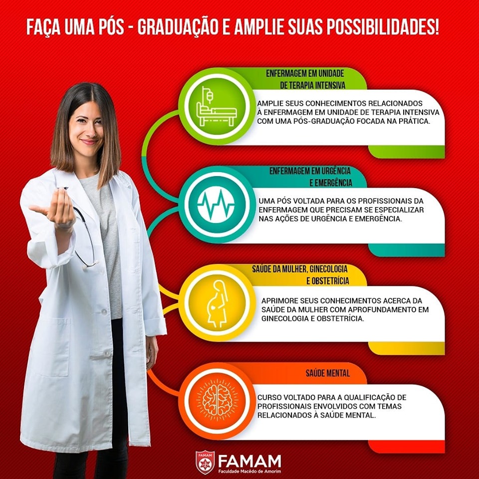 A FAMAM chegou para lhe direcionar nas melhores escolhas. Escolha o melhor para sua carreira profissional. Vá além da graduação. A Pós-graduação de Enfermagem em Urgência e Emergência prepara profissionais para atuarem com agilidade, de forma humanizada, no atendimento de pacientes adultos, pediátricos e idosos em situações de emergência e urgência.