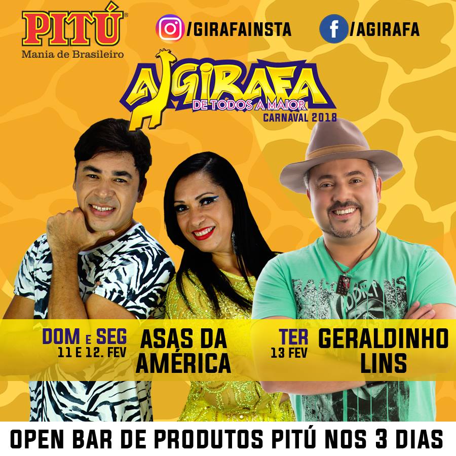 Para 2018 a diretoria da “Girafa” mantém a eclética e vibrante Banda Asas da América – domingo e segunda – e trás para a terça de carnaval um dos artistas da nova geração pernambucana com mais carisma e versatilidade, o Geraldinho Lins.