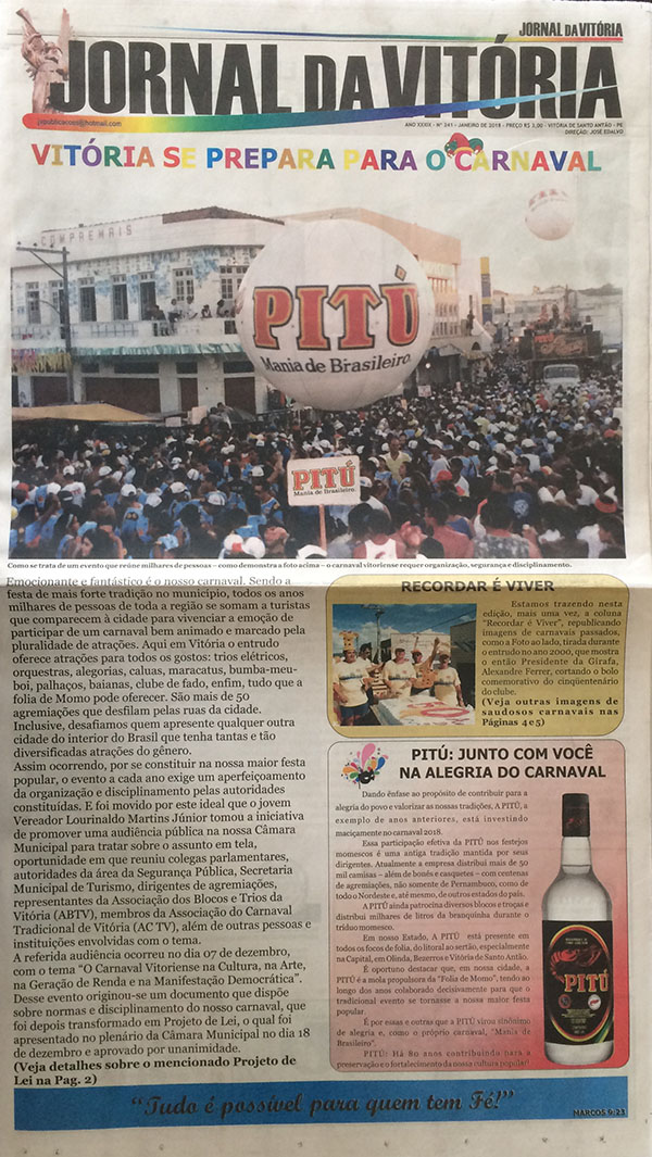 Como todos os foliões vitorienses já estão “carecas” de saber, “NA SAUDADE, A GENTE BRINCA MELHOR”. Esse ano, nosso desfile homenageará os 80 anos do Engarrafamento PITÚ e os 60 anos da Orquestra SUPER OARA. Veja o vídeo da música nova, composta em parceria por Aldenisio Tavares, Samuka Voice e Elaque Amaral (Super Oara).