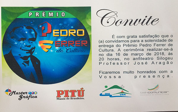 Conforme anunciado aconteceu na noite da sexta (16) no Teatro Silogeu José Aragão a primeira edição do Premio Pedro Ferrer de Cultura. A iniciativa buscou homenagear pessoas e/ou instituições que contribuem para o engajamento cultural do município.
