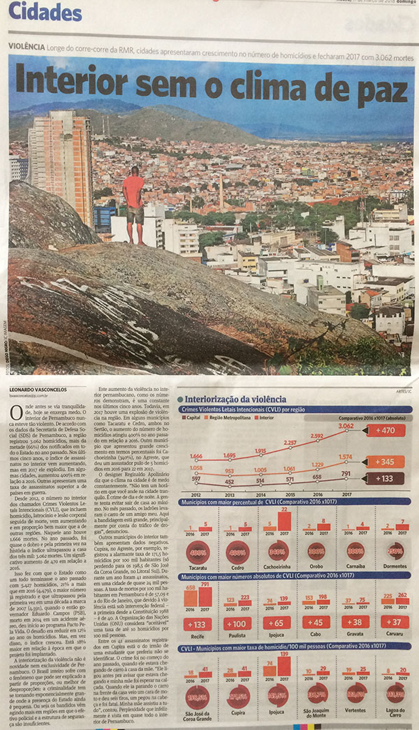 Com o título: “Interior sem clima de paz” o Jornal do Commercio do último final de semana (10 e 11) publicou, no seu caderno “Cidades”,  uma reportagem atinente ao aumento da violência nos municípios que estão fora da Região Metropolitana do Estado. Nela, explicita-se, em  números e percentuais,  aquilo que todos nós sentimos na pele, isto é: sensação real insegurança!!
