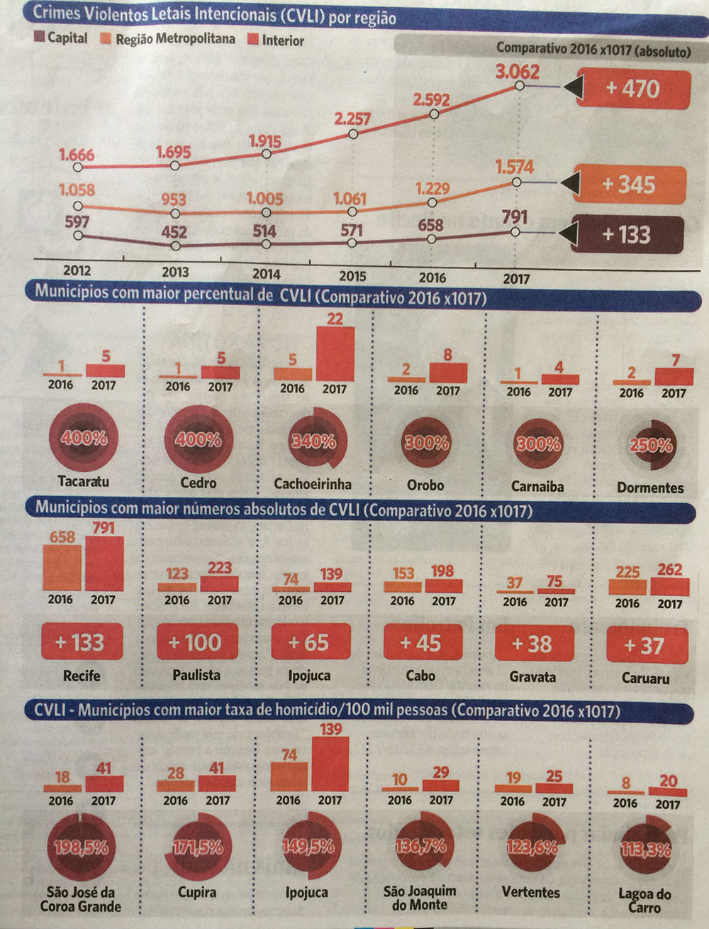 Pernambuco terminou o ano de 2017 com 21% a mais que em 2016. Saltamos de um ano para o outro de  4.479 para 5.427. Um aumento de 21%. A política praticada pelo governador Paulo Câmara, nos últimos três anos, nos quatro cantos do estado,  no que se refere à segurança pública, foi um desastre.