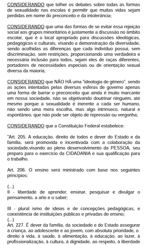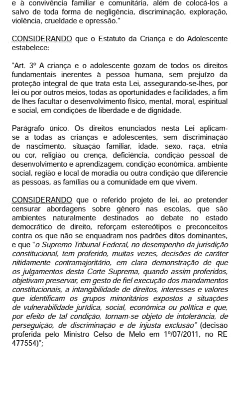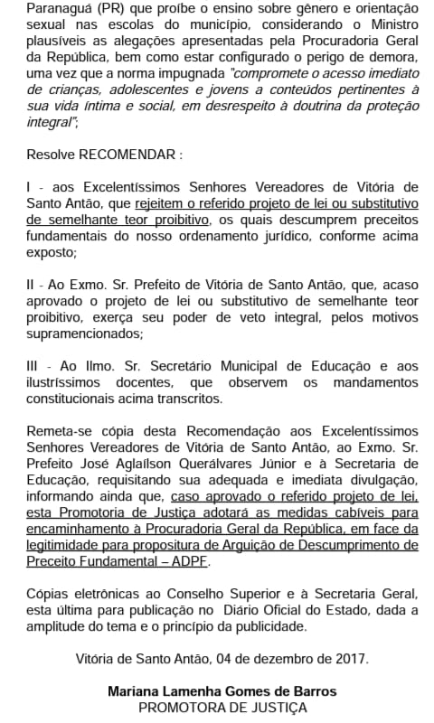 No bojo do seu conteúdo o mesmo dispõe que “fica proibida a inserção na grade curricular das escolas do Município da Vitória de Santo Antão a orientação política pedagógica aplicada à implantação e ao desenvolvimento de atividades pedagógicas que visem à reprodução do conceito de ideologia de gênero”.