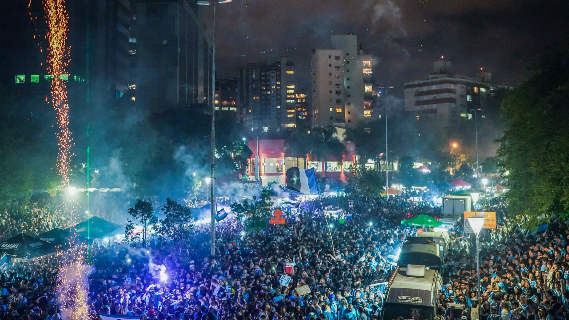 Fans of Brazil’s Gremio watch their team during the 2017 Copa Libertadores game against Argentina’s Lanus on the streets of Porto Alegre, Brazil, on November 29, 2017. / AFP PHOTO / Jefferson BERNARDES (Photo credit should read JEFFERSON BERNARDES/AFP/Getty Images)