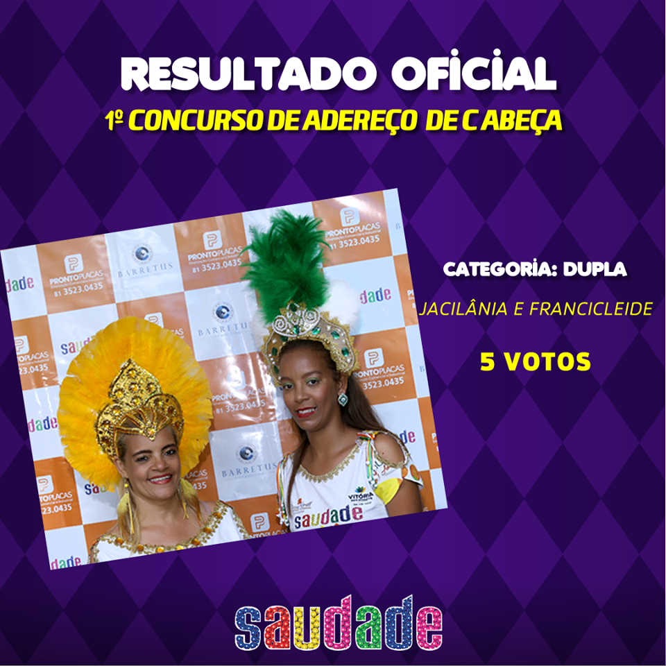 Na semana passada recebemos no blog as vencedoras – na categoria dupla – do Primeiro Concurso de Adereço de Cabeça da Saudade. Jacilânia e Francicleide – mãe e filha – são figuras já “carimbadas” no desfile da agremiação. As duas já trabalham, no período carnavalescos,  com adereços. Parabéns as amigas pelo investimento e criatividade. Como prêmio, receberam dois kits SAUDADE 2019 e R$ 100,00 em dinheiro. Veja o vídeo: