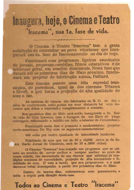 Mas foi só no ano de 1910 que nossa cidade ganhou, de fato, o seu primeiro cinema – Cinema Vitória – como noticiou também, em 20 de agosto 1910, O “Jornal o Popular”: