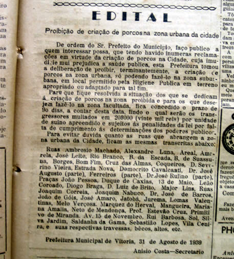 Conforme matéria veiculada no Jornal “O Vitoriense” de 1939 o então Prefeito da época, através de seu secretário Anísio Costa, decretavam o fim das criações de porcos na Zona Urbana da cidade. Como se vê, no ano em que nascia o atual Prefeito Elias Lira, o gestor da época dava um bom exemplo de como se governar uma cidade em sintonia com as transformações impostas pela mudanças de comportamento necessárias para cada tempo.