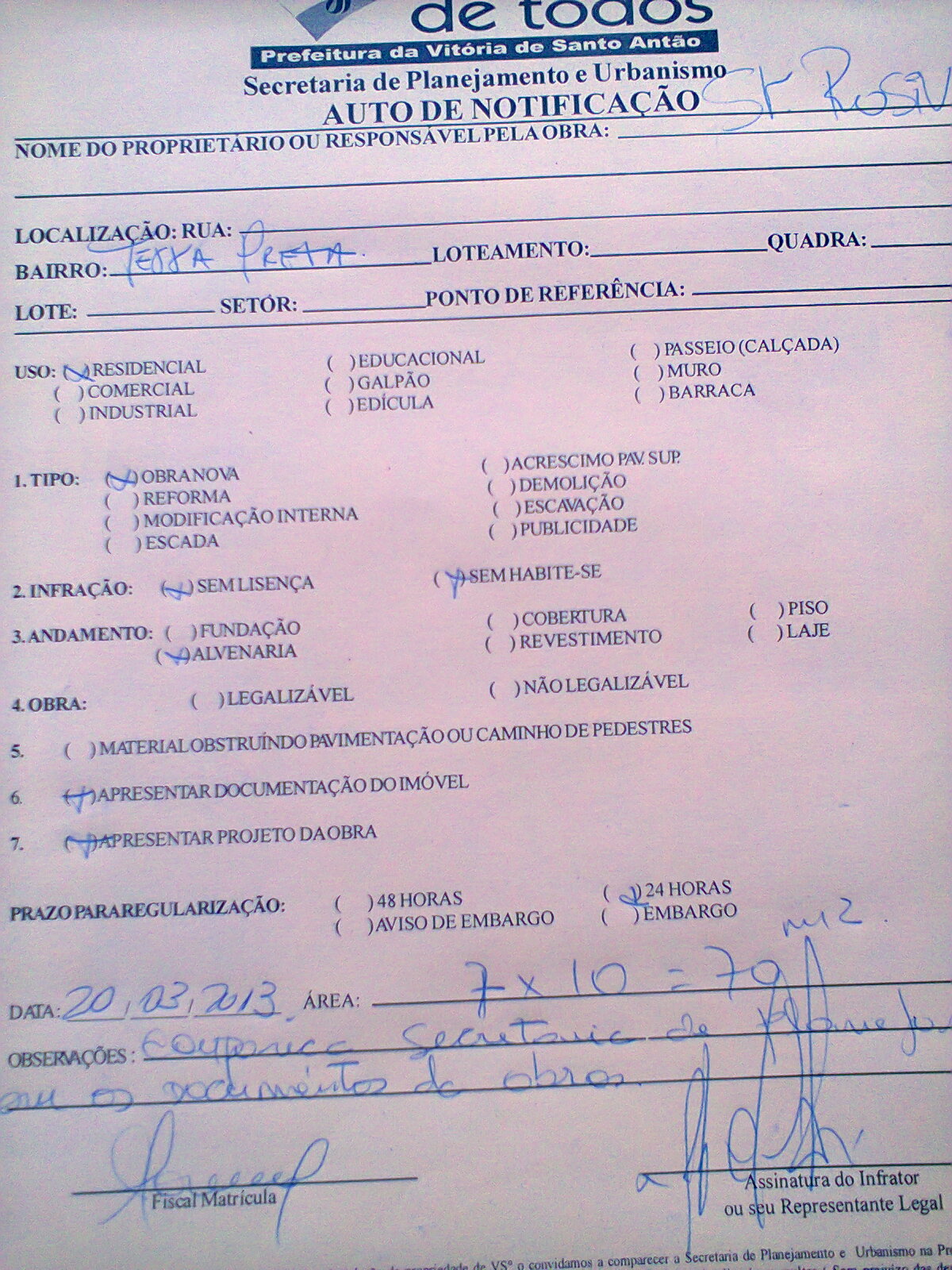 Cumprimentando a todos informo que funcionando como advogado embarguei uma construção irregular no nosso município por irregularidade.