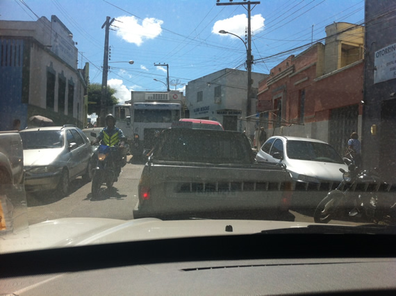 Uma das principais ruas da Vitória que serve como via de acesso ao comercio da nossa cidade hoje amanheceu tomada pelos caminhões de cargas e descargas que abastecem os super mercados e por motoristas que chegam em nossa cidade pensando que é autoridade e mandam e desmandam nas ruas. Hoje ao sair de casa para ir ao trabalho me deparei com um caminhão de número ‘19’ simplesmente fechando a rua sem mais e nem menos o motorista se retirou do caminhão e saiu andando deixando a fila de carro a sua espera logo a frente e ainda mais para completar o caos bancos de feira jogados no meio da rua e por cima das calçadas.