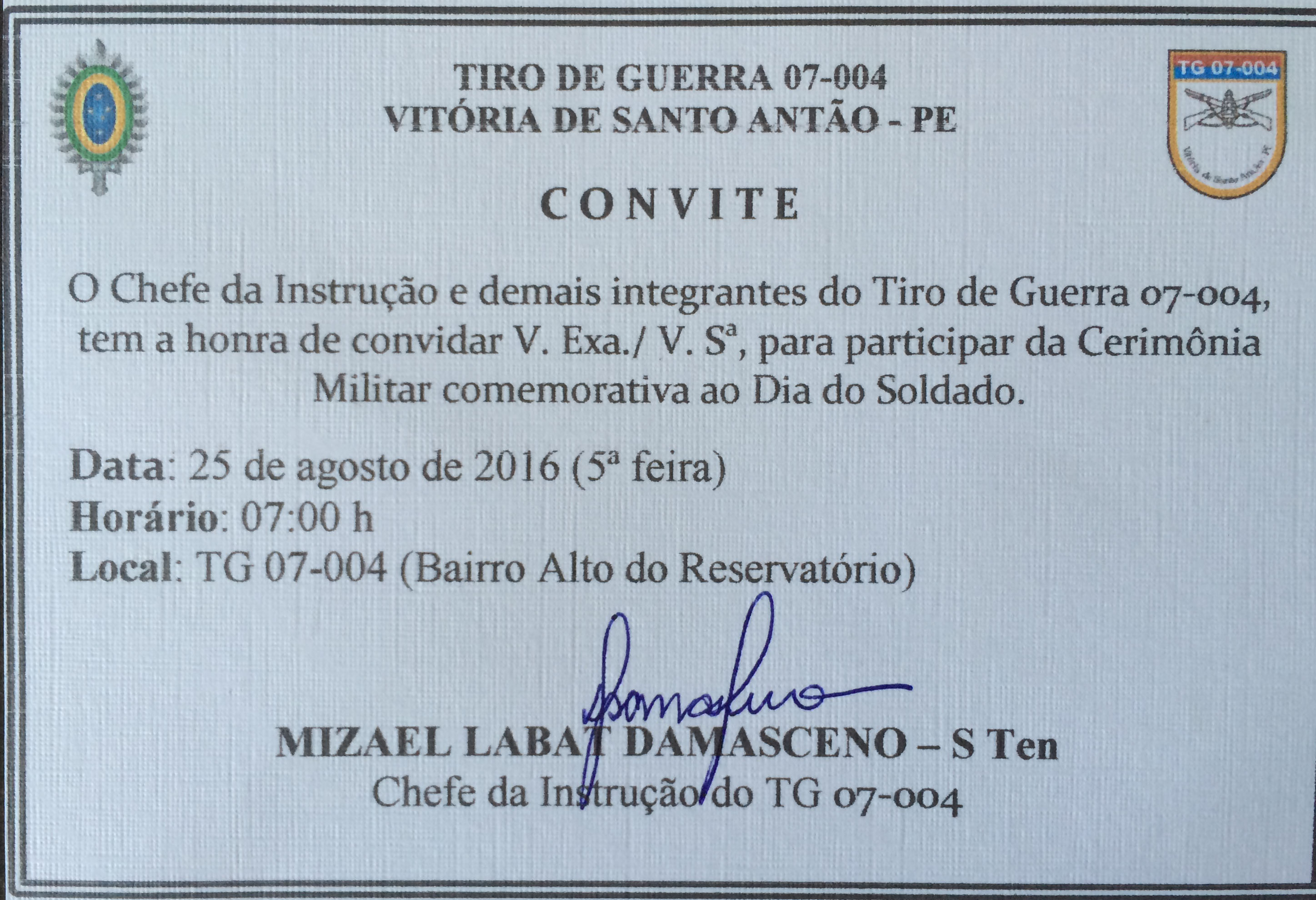 Tiro de Guerra celebra o Dia do Soldado. Publicado em 24 de agosto de 2016 por Cristiano Pilako Amanhã, 25 de agosto, comemora-se o Dia do Soldado. Na qualidade de ex-Atirador, do nosso Tiro de Guerra, participarei do evento comemorativo que ocorrerá na sede do Tiro de Guerra, localizada no Alto do Reservatório.