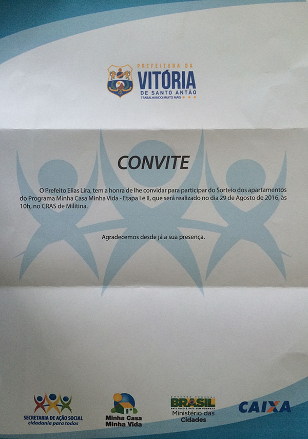CONVITE. Publicado em 26 de agosto de 2016 por Cristiano Pilako Registro o recebimento do convite, enviado pelo prefeito Elias Lira, para o evento que ocorrerá na próxima segunda, dia 29 às 10h, que tem como objetivo à realização do sorteio do Programa Minha Casa Minha Vida. Desde já, agradeço pela lembrança.
