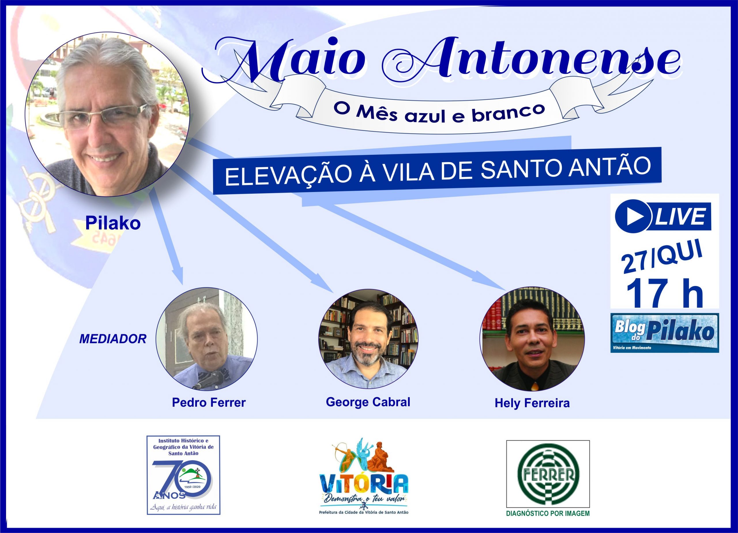 Na “Live” de amanhã, quinta-feira, 27 de maio, além do presidente do nosso Instituto Histórico, professor Pedro Ferrer, teremos, também, dois professores que irão, justamente, realçar o processo de transformação e seus respectivos desdobramentos no sentido da nossa elevação à categoria de vila – Vila de Santo Antão, a parir de maio de 1812. George Cabral e Hely Ferreira nos brindarão com boas explicações. Portanto, reforçamos o convite aos internautas para acompanhar mais esse bate-papo, promovido pelo Blog do Pilako dentro do Projeto “Maio Antonense”, o mês azul e branco.