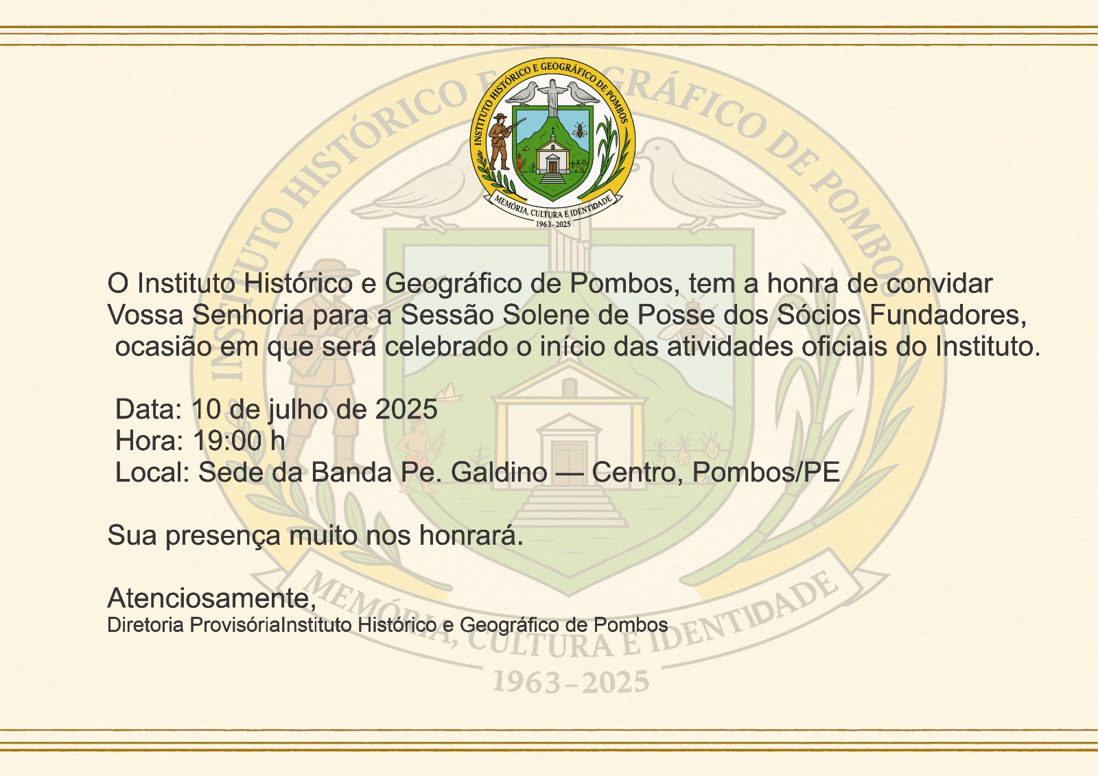Daqui, da Vitória de Santo Antão, que um dia já foi chamada de Povoado de Santo Antão, Freguesia de Santo Antão, Vila de Santo Antão e  Cidade da Vitória,  envio-lhe os melhores votos de prosperidade e saúde, sobretudo nessa passagem dos nossos 400 anos de história. Muito obrigado, amigo Péricles Miranda….